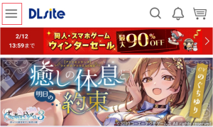 DLsiteのトップページの左上のメニュー[ ☰ ] のアイコンをタップして、メニューを開きます。