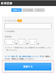 メールを開くと[ユーザー登録:情報入力ページへ]というボタンが表示されているのでクリックします。