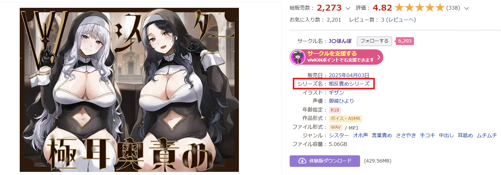 画像はサークル『J〇ほんぽ』さんの『【全編ぐっぽり両耳奥舐め】Wシスターによる極耳奥舐め〜射精応援と射精管理を同時にされる脳バグ「相反責め教会」2〜』(DLsite・FANZA)の作品情報ですが、DLsite側にのみ存在する”シリーズ名”のリンクで同一シリーズの作品をたどることができるのが結構便利だったりします。